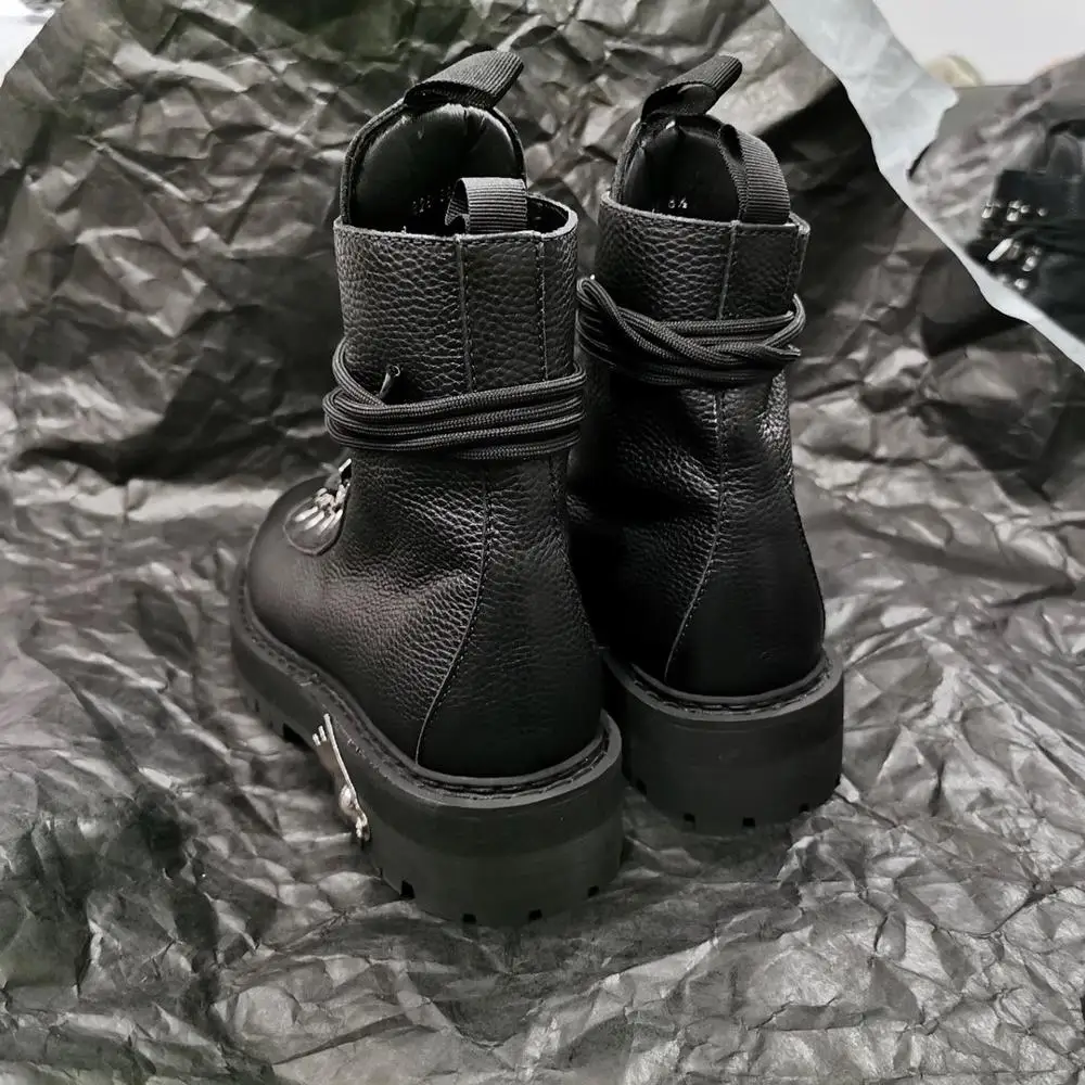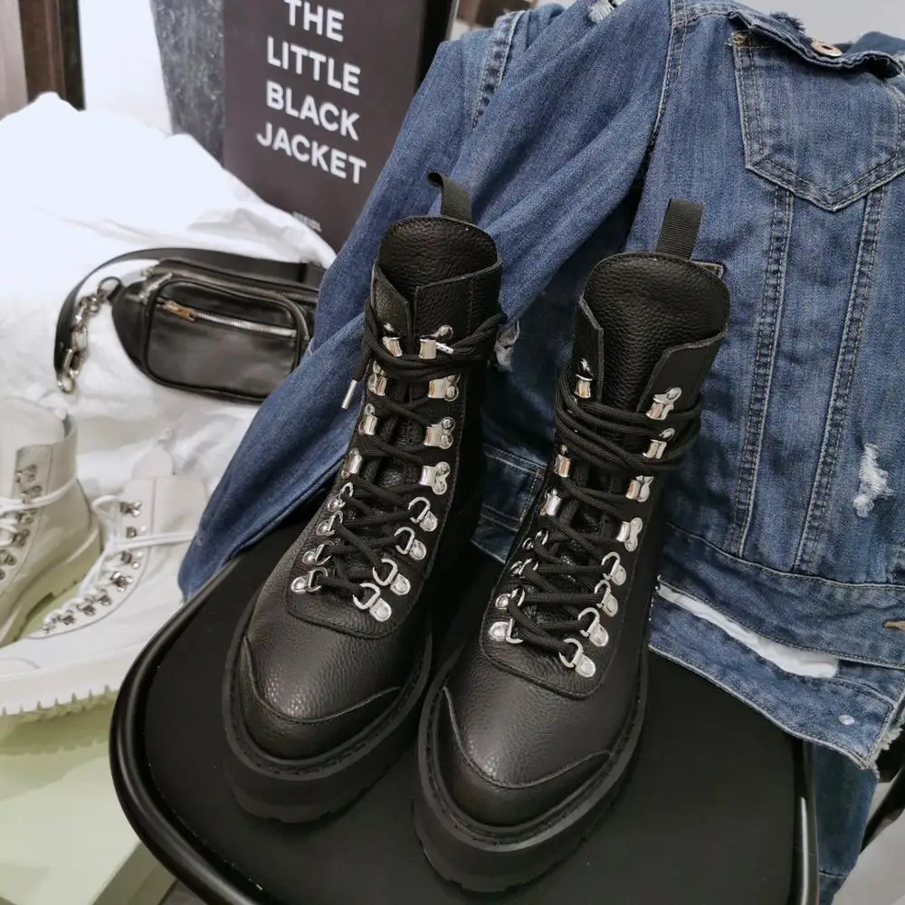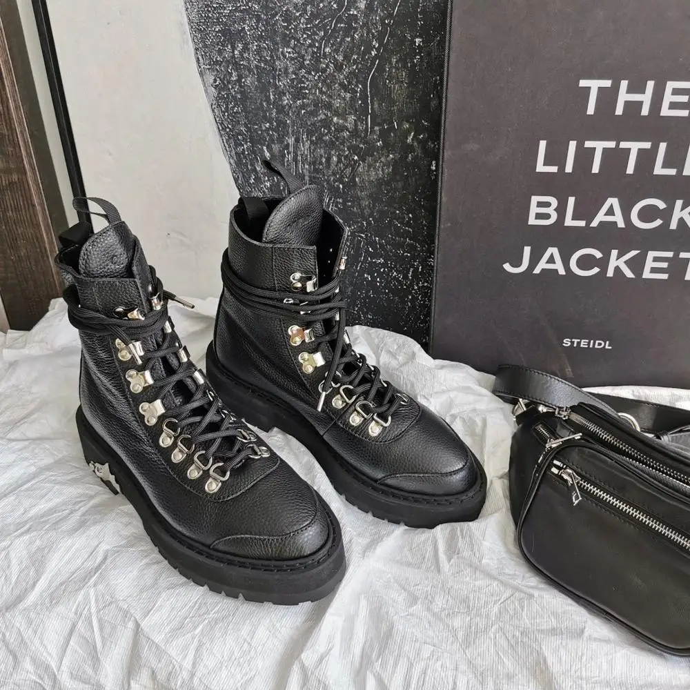 Big Discount Vibsterimma New Hiking White Leather Ankle boots Women Genuine Leather Biker Boots Metal Decoration