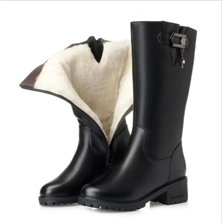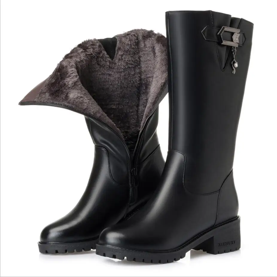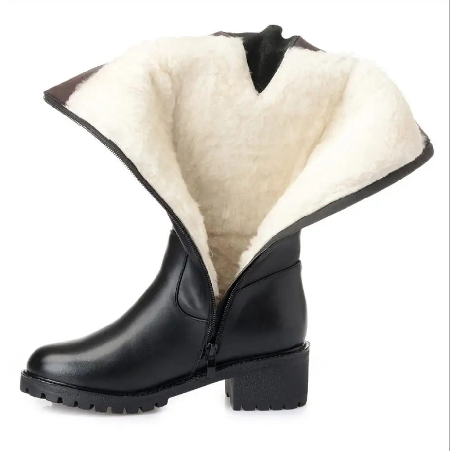Promo D-397 Big size women winter boots genuine leather women motorcycle boots warm wool Thick heel mid t